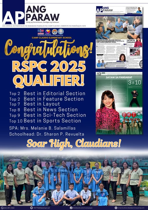 A Proud Moment for Ang Paraw of CCES! July 20, 2025 By: Ma. Jenelie R. Patricio | Teacher I Ang Paraw, the official school publication of Camp Claudio Elementary School, has once again brought pride and honor to the school community after qualifying for the prestigious Regional Schools Press Conference (RSPC) 2025! Demonstrating excellence in continue reading : A Proud Moment for Ang Paraw of CCES!