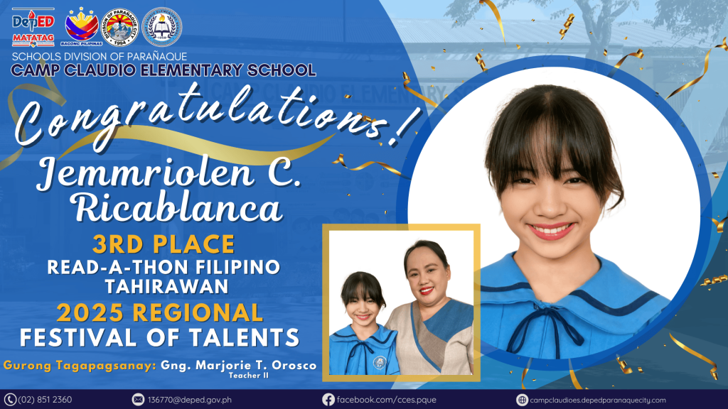 Camp Claudio Elementary School extends its warmest congratulations to Jemmriolen C. Ricablanca, a Grade 6 pupil, for winning 3rd Place in the Read-a-Thon Filipino: Tahirawan category during the 2025 Regional Festival of Talents held from February 20–22, 2025, in Valenzuela City.